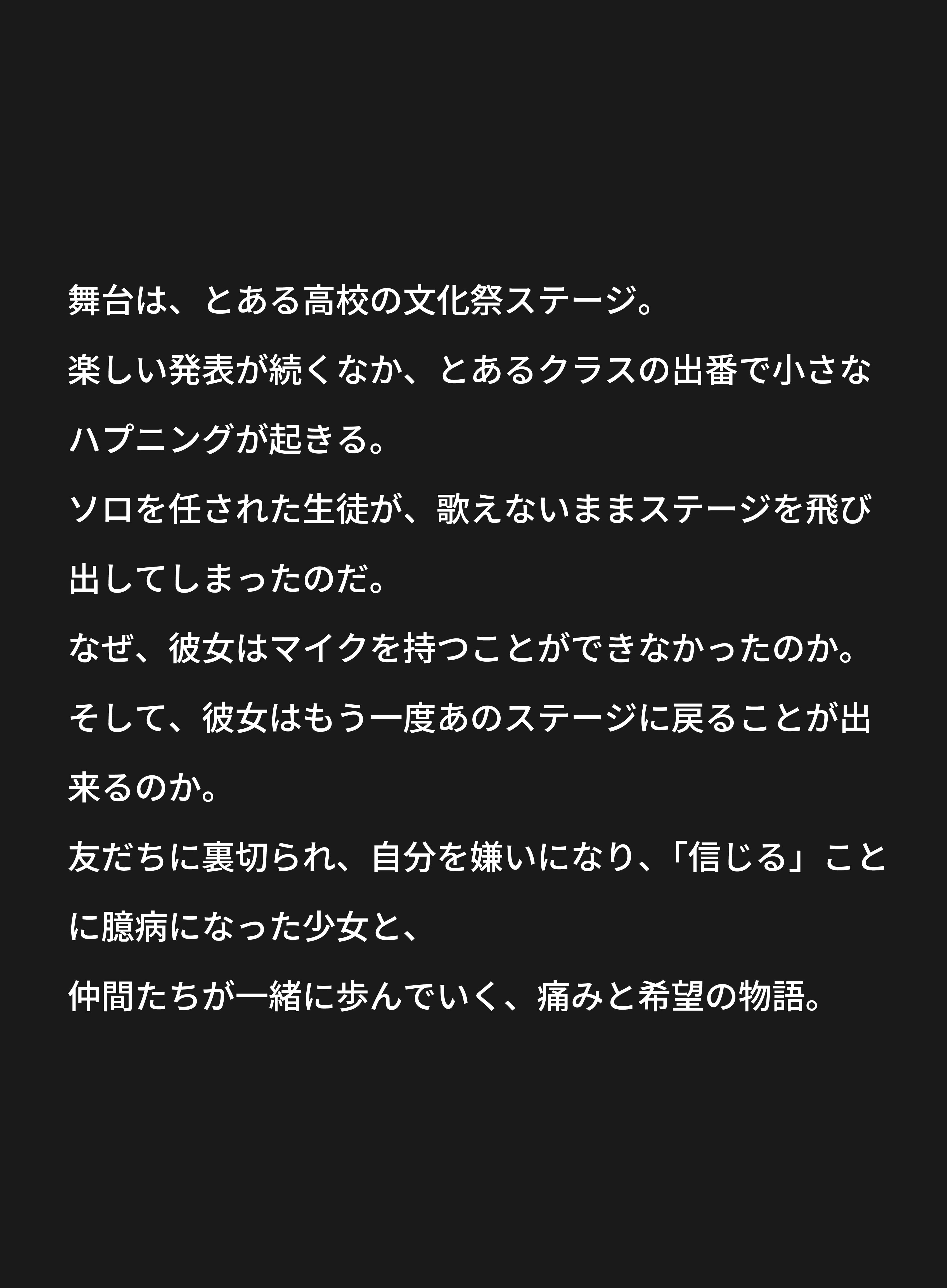 楽しい発表が続くなか、とあるクラスの出番で小さなハプニングが起きる。ソロを任された生徒が、歌えないままステージを飛び出してしまったのだ。なぜ、彼女はマイクを持つことができなかったのか。そして、彼女はもう一度あのステージに戻ることが出来るのか。
